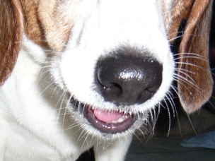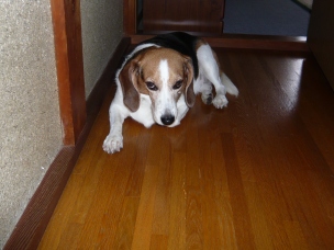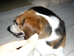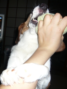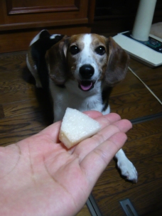 娘さん!! 二十世紀梨くださいっ!! 「マテ!」 (梨を近づけると…) 見ない、見ない。 「ヨシ!」 シャクシャク ジューシー!!