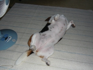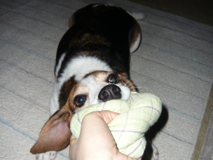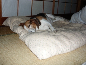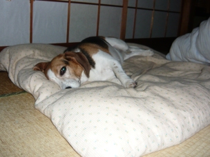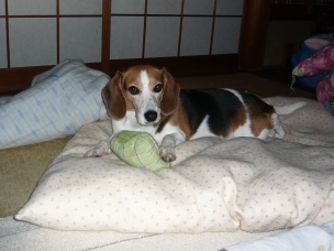(“遊んで~!BOW WOW !!”とおもちゃ置き場に向かって吠えていたので おもちゃを取ってきて、投げたり、引っ張り合いしたり、振り回したり、 そしてまた投げたりして遊んであげていたのですが…) (遊ぶ気満々だったわりに、たった5分ぐらいで急に動きが止まり…) (人間様の昼寝用掛け布団をくわえて運び、自分のベッドの横に放置したあと それで満足したのか) もう寝ますよ…。 「リブちゃん、もう遊ぶの満足したん?」