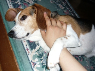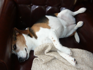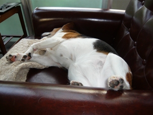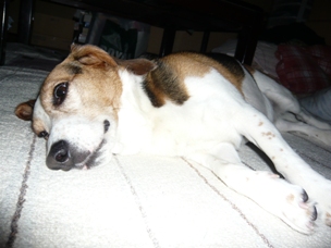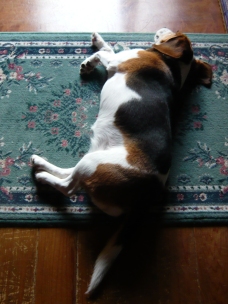 (最近の散歩後のリブはややおとなしめです) 散歩から帰ってきました。 今日も日差しが強くて、暑かったですよ。 だから、少しへばってますよ。 お父さんとお母さんも出かけちゃったし… 静かで… 眠くなってきました…。 寝ちゃおう。パタッ… 娘さんがサラダ作りを始めたら すぐに起き上がって 見に行きますよ。