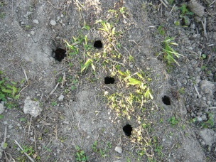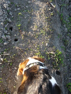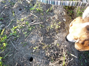 なんなんですか?この穴は… クンクン… 「うわ!なにこれ…」 ここもですよ。 クンクン… 「この畦道、穴だらけやん…。気持ち悪っ」 ここも…。 クンクン…。 「これ、全部ヘビの穴やったら、相当怖いよ」 端から端まで穴だらけでした。 「いや~気持ち悪い~」