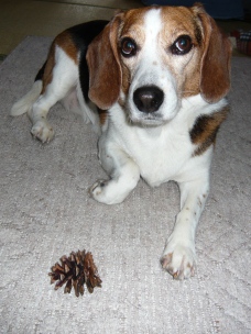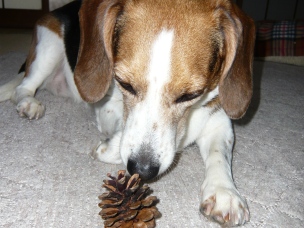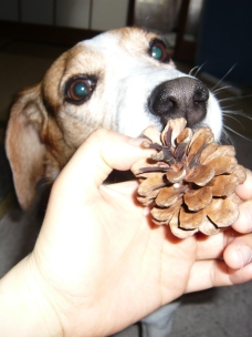 「リブちゃん、お留守番ありがとう~」 (留守番ありがとうの儀式) 娘さぁ~ん 「リブちゃんにおみやげ~」 なんですかっ!! 「まつぼっくり」 クンクン カジカジ… んー… ペロッ… これ 食べられないですよね? 「あ…バレちゃった?」