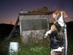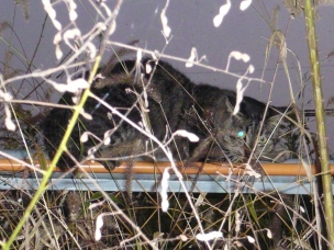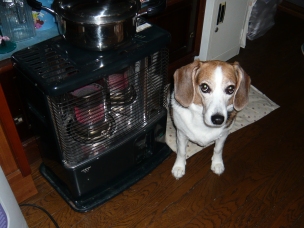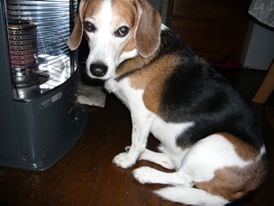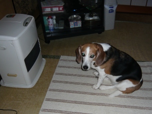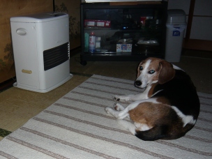 (居間のヒーターを点けてみました) (自然にその前に座りました)